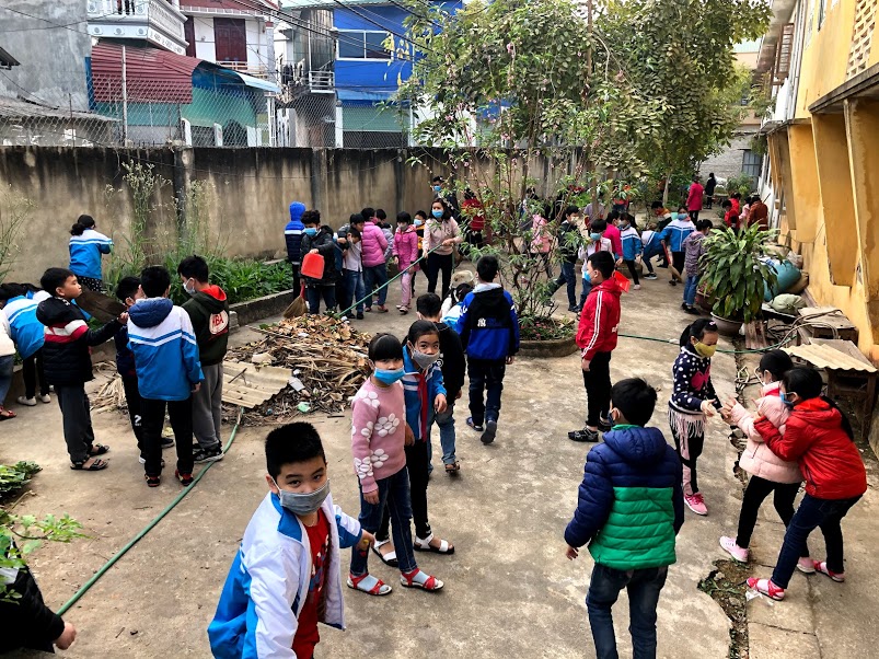 Thầy và trò trường TH Hà Nội - Điện Biên Phủ vệ sinh trường, lớp học phòng chống dịch bệnh Covid-19