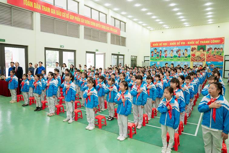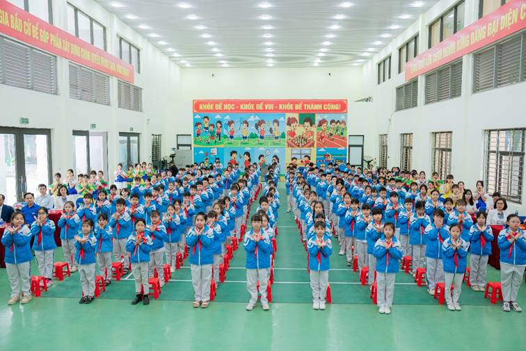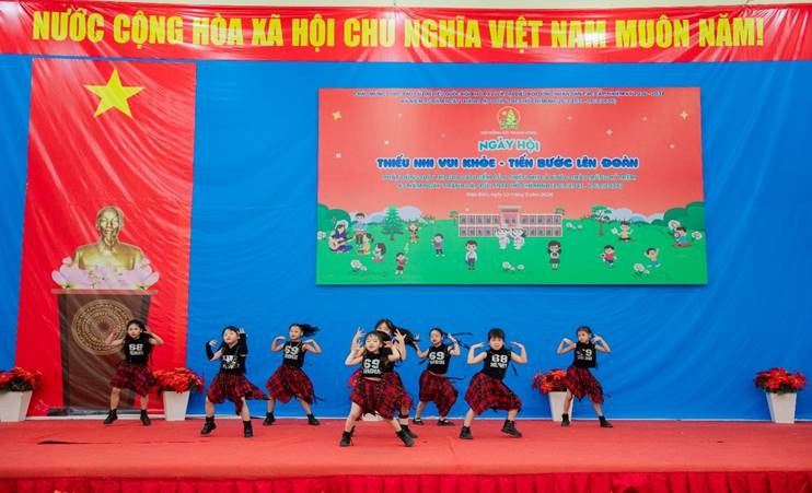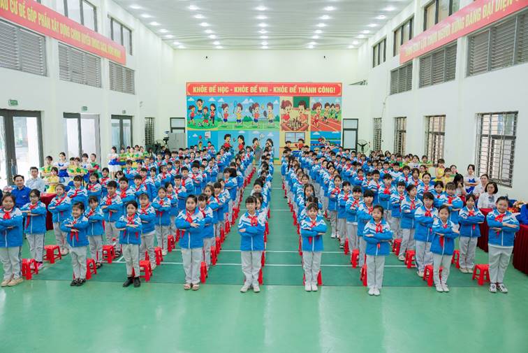 Các em học sinh còn tham gia đồng diễn sân trường với những động tác khỏe khoắn, đồng đều và đầy khí thế, thể hiện tinh thần rèn luyện thể chất, sự tự tin và đoàn kết của đội viên, thiếu nhi.