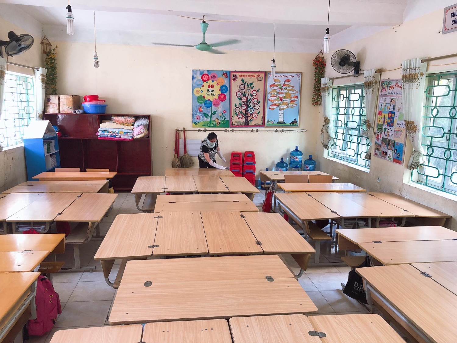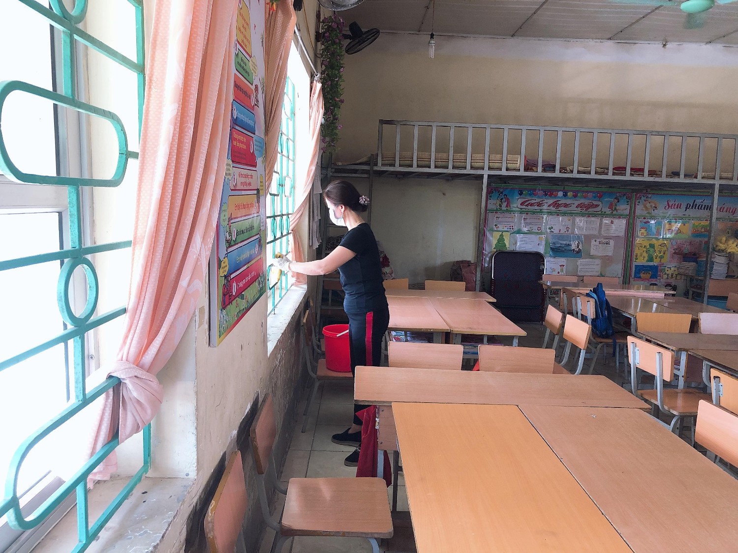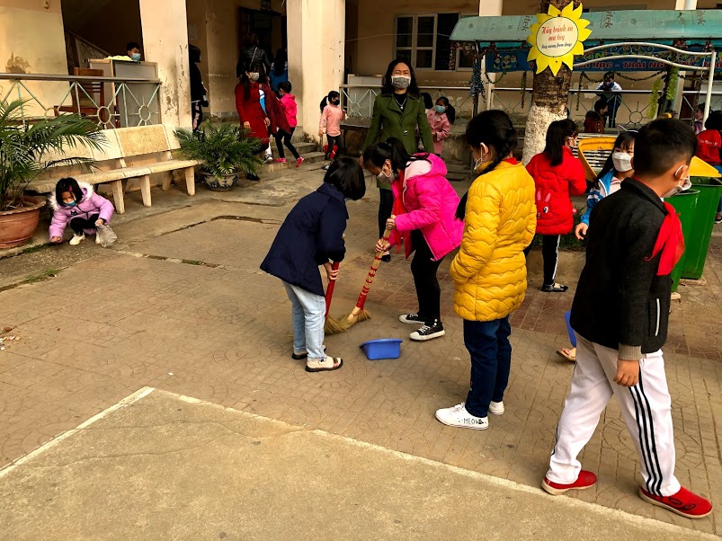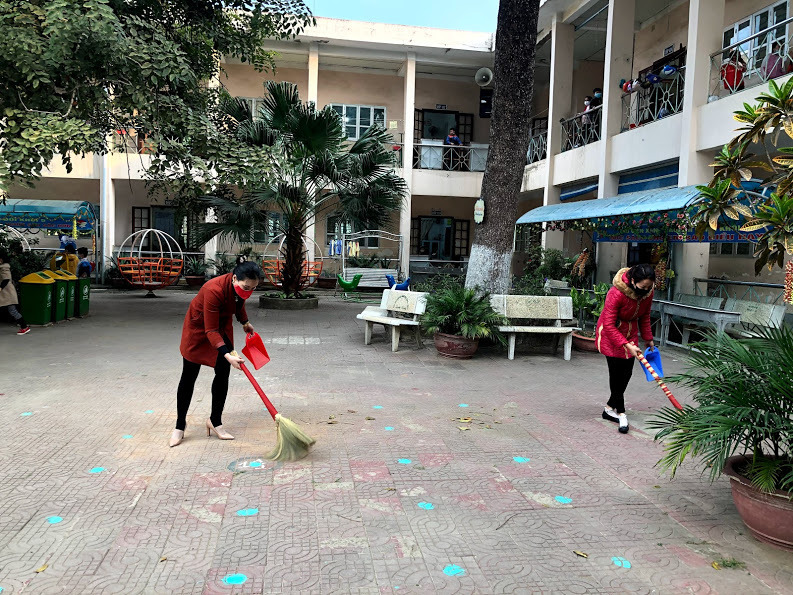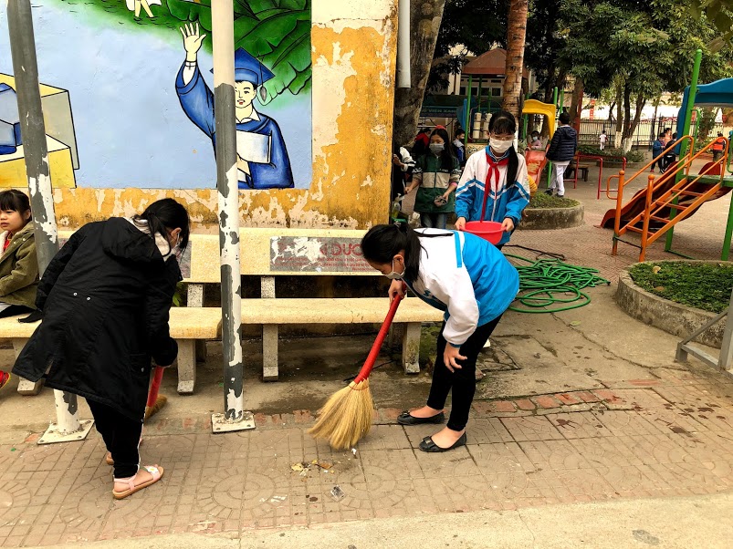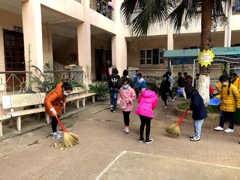 Thầy và trò trường TH Hà Nội - Điện Biên Phủ vệ sinh trường, lớp học phòng chống dịch bệnh Covid-19