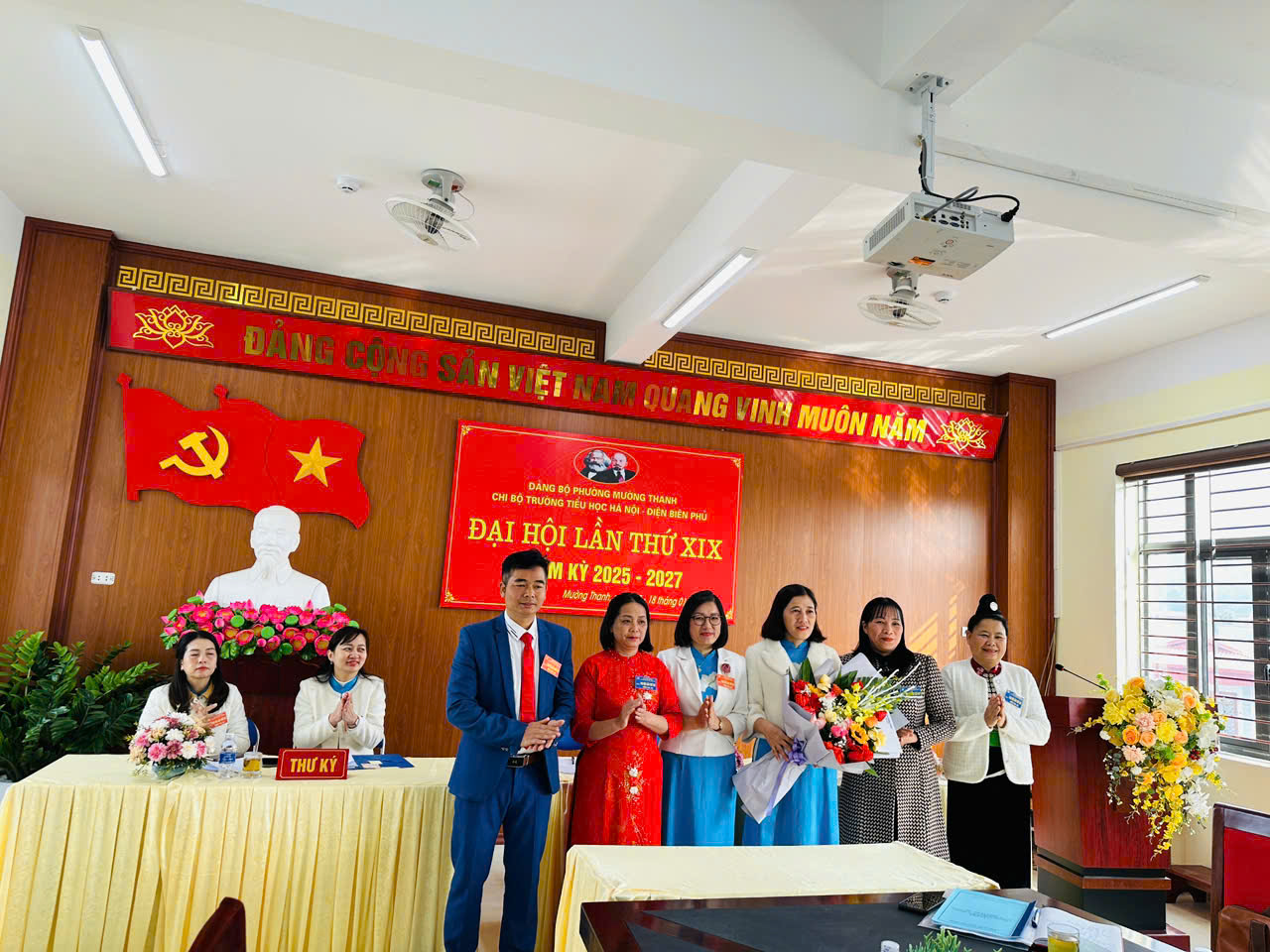 Thực hiện Điều lệ Đảng Cộng sản Việt Nam; Thực hiện Hướng dẫn số 05-HD/ĐU ngày 25/10/2025 của Đảng ủy phường Mường Thanh về Đại hội các chi bộ trực thuộc nhiệm kỳ 2025 - 2027. Sáng ngày 18/1/2025 Chi bộ Trường Tiểu học Hà Nội - Điện Biên Phủ đã long trọng tổ chức Đại hội Chi bộ nhiệm kỳ 2025 - 2027 nhằm đánh giá kết quả thực hiện Nghị quyết Đại hội nhiệm kỳ 2022 - 2025 và đề ra phương hướng, nhiệm vụ nhiệm kỳ 2025 - 2027, bầu cấp ủy Chi bộ, Bí thư, phó Bí thư chi bộ nhiệm kỳ 2025 - 2027. Về dự và chỉ đạo Đại hội về phía Đảng ủy phường Mường Thanh có: Đ/c Nguyễn Thị Oanh - Thành uỷ viên, Bí thư Đảng uỷ phường, đ/c Bùi Thị Khanh – Phó Bí thư Thường trực Đảng uỷ phường, đ/c Lò Thị Hiêng – Chủ tịch Ủy ban MTTQ phường, PCT Hội đồng TĐKT phường Mường Thanh; về phía Phòng GD&ĐT có đ/c Hoàng Bích Huệ - Nhóm trưởng Chuyên môn Tiểu học, đ/c Thẩm Thị Nga- Chuyên môn Tiểu học đã đến dự và chúc mừng Đại hội. Tại Đại hội, đồng chí Lê Thị Nga Bí thư Chi bộ đã trình bày báo cáo chính trị, đánh giá những thành tựu nổi bật trong công tác lãnh đạo, chỉ đạo của Chi bộ trong nhiệm kỳ qua. Báo cáo nhấn mạnh các kết quả đạt được trong việc nâng cao chất lượng giáo dục, phát huy văn hóa học đường và vai trò nòng cốt của Chi bộ trong các hoạt động đoàn thể, xã hội. Đại hội cũng đã thảo luận sôi nổi, đóng góp ý kiến vào dự thảo phương hướng, nhiệm vụ nhiệm kỳ 2025 - 2027. Chi bộ tiếp tục khẳng định vai trò lãnh đạo toàn diện, tập trung vào các nhiệm vụ trọng tâm như: Nâng cao chất lượng giáo dục toàn diện, đẩy mạnh chuyển đổi số trong quản lý và giảng dạy, xây dựng đội ngũ cán bộ, giáo viên đoàn kết, vững mạnh. Với tinh thần đoàn kết, dân chủ, đại hội diễn ra nghiêm túc; mỗi đảng viên của chi bộ đã ý thức rất rõ về quyền và nghĩa vụ của mình trong việc bầu chọn ra người đủ đức, đủ tài qua từng lá phiếu. Đại hội đã tiến hành bầu Chi ủy, Bí thư, Phó bí thư theo đúng quy định của điều lệ Đảng và đã xây dựng thành công Nghị quyết của chi bộ trong nhiệm kỳ 2025-2027. Kết quả bầu cử, đồng chí Lê Thị Nga được bầu giữ chức vụ Bí thư Chi bộ, đồng chí Nguyễn Thị Mỹ Hương - Phó Bí thư chi bộ và các đồng chí Nguyễn Thị Kim Anh, Lê Thị Tuyên - Chi ủy viên nhiệm kì 2025-2027 (01 đ/c để khuyết chờ khi có quyết định bổ nhiệm Ban giám hiệu mới). Đại hội đã tiến hành bầu cử 05 đại biểu dự Đại hội Đảng bộ phường khoá VIII, nhiệm kỳ 2025-2030. Đại hội Chi bộ nhiệm kì 2025 - 2027 của trường Tiểu học Hà Nội - Điện Biên Phủ đã thành công rực rỡ. Mỗi thành viên trong cấp ủy mới và tập thể cấp ủy nhiệm kỳ mới nguyện đoàn kết, trách nhiệm, ra sức rèn luyện về mọi mặt để góp phần thực hiện thắng lợi Nghị quyết Đại hội chi bộ đã đề ra./. Sau đây là một số hình ảnh tại Đại hội Chi bộ Trường Tiểu học Hà Nội – Điện Biên Phủ: