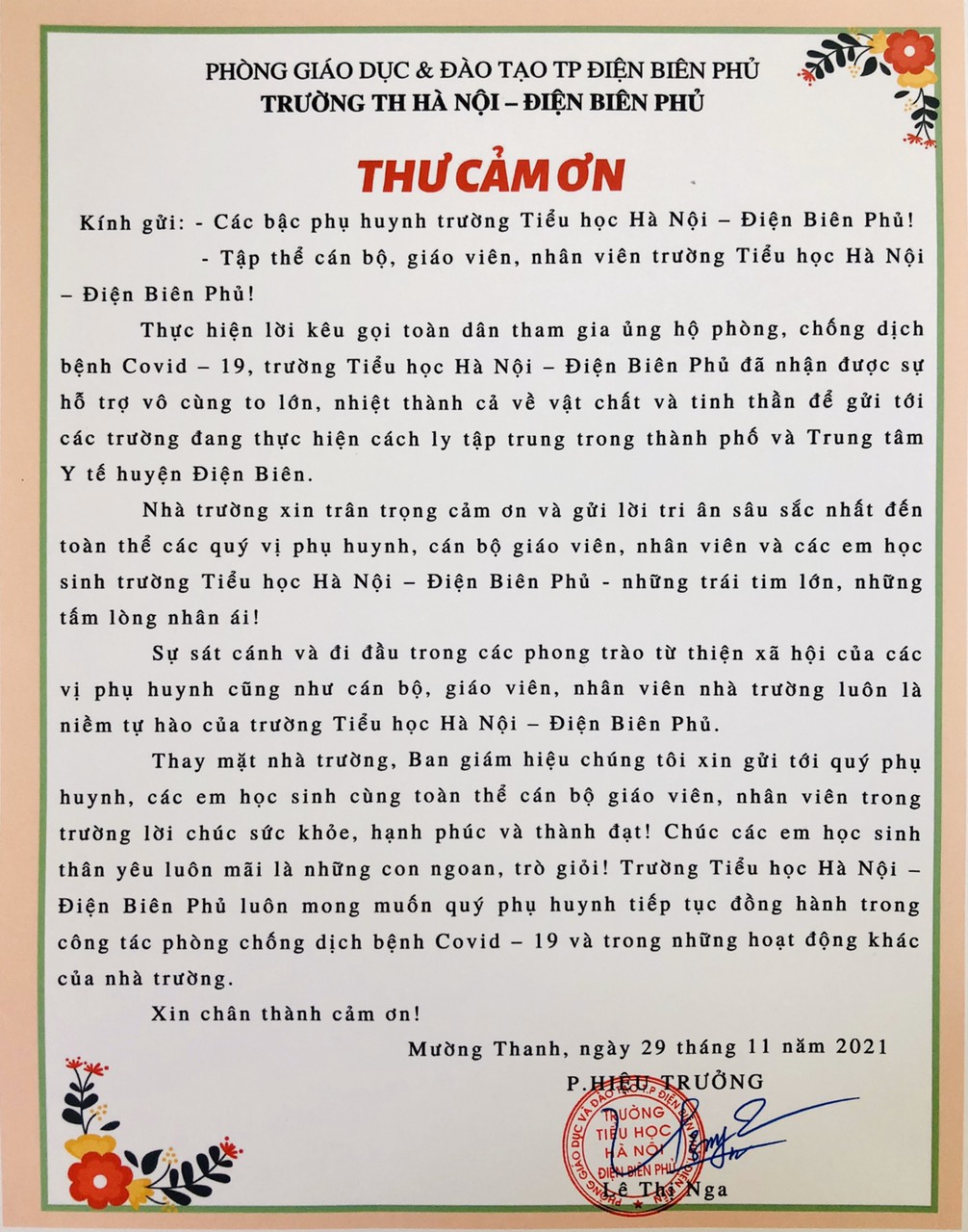 Thư cảm ơn tới CBGV, NV, các bậc PH trường TH Hà Nội - Điện Biên Phủ